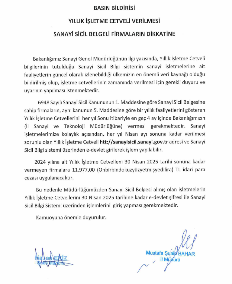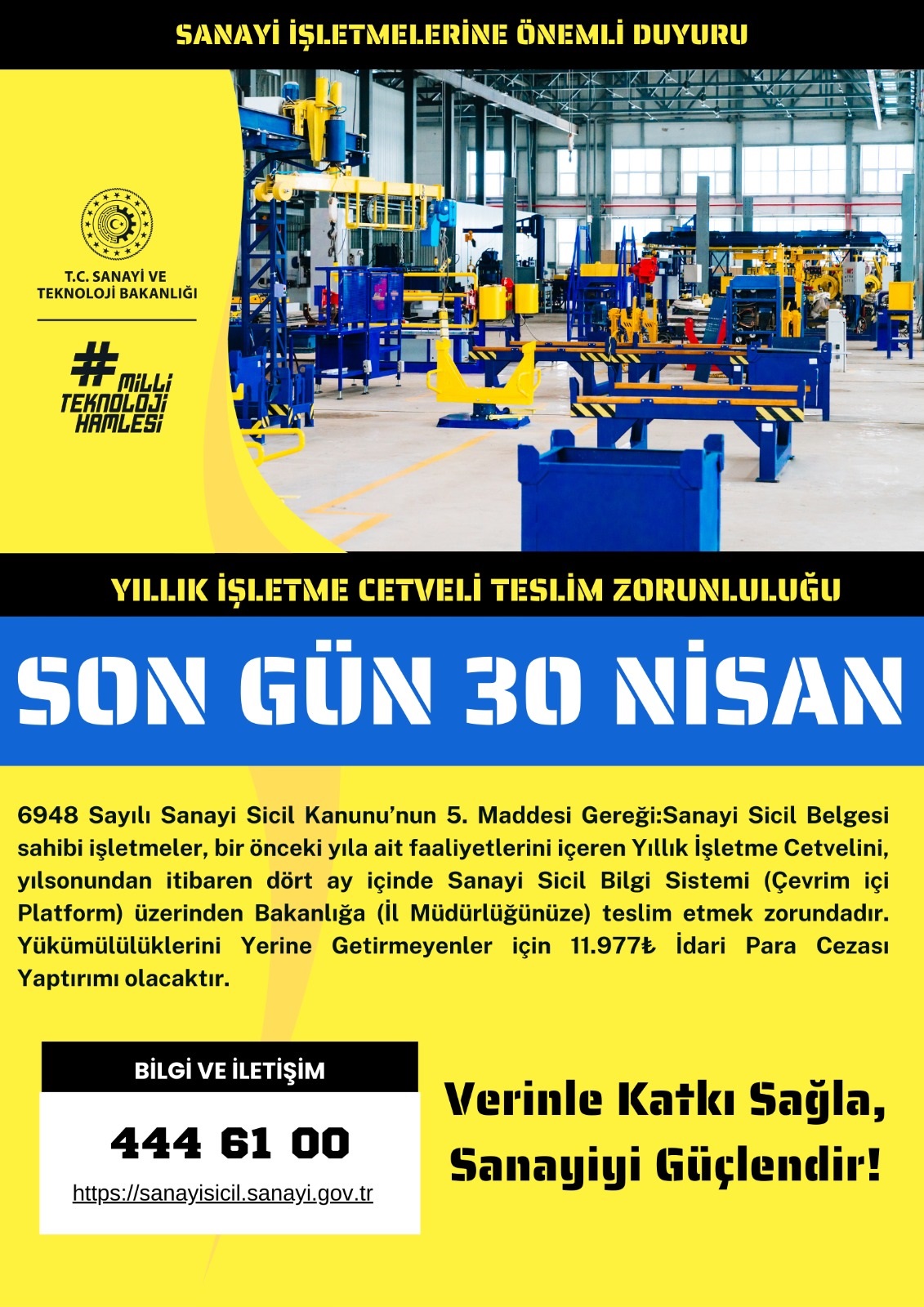 T.C.Osmaniye Valiliği, İl Sanayi ve Teknoloji Müdürlüğü tarafından bildirilen yıllık işletme bakım cetveli bildirisi ve ilgili afiş ekte yer almaktadır. İlgili katılımcılarımızın bilgisine.